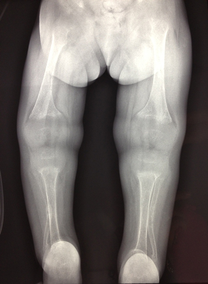 The patient had low serum total calcium and inorganic phosphate levels and a markedly elevated alkaline phosphatase level (Box 1). A skeletal survey showed significantly osteopenic bones, with flaring of the metaphyses in the long bones, soft tissue swelling around the elbow and wrist joints, and steep acetabular angles (Box 2). She had acute and healed fractures in multiple places: the right proximal ulnar shaft; both distal radial shafts; mid shafts of the second, third and fourth metacarpals of the right hand; mid shaft of the second metacarpal of the left hand; and mid shafts of the third metatarsals of both feet.