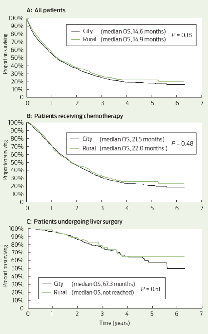 Results: Of 2289 patients, 624 (27.3%) were rural. There was a higher proportion of male patients in the rural cohort, but other patient characteristics did not significantly differ between the cohorts. Equivalent rates of chemotherapy administration between city and rural patients were observed across each line of treatment (first line: 56.0% v 58.3%, P = 0.32; second line: 23.3% v 22.5%, P = 0.78; and third line: 10.1% v 9.3%, P = 0.69). A higher proportion of city patients received combination chemotherapy in the first-line setting (67.4% v 59.9%; P = 0.01). When an oxaliplatin combination was prescribed, oral capecitabine was used more frequently in rural patients (22.9% v 8.4%; P < 0.001). No significant difference was seen in rates of hepatic resection or other non-chemotherapy treatments between cohorts. Median overall survival was equivalent between city and rural patients (14.6 v 14.9 months, P = 0.18).