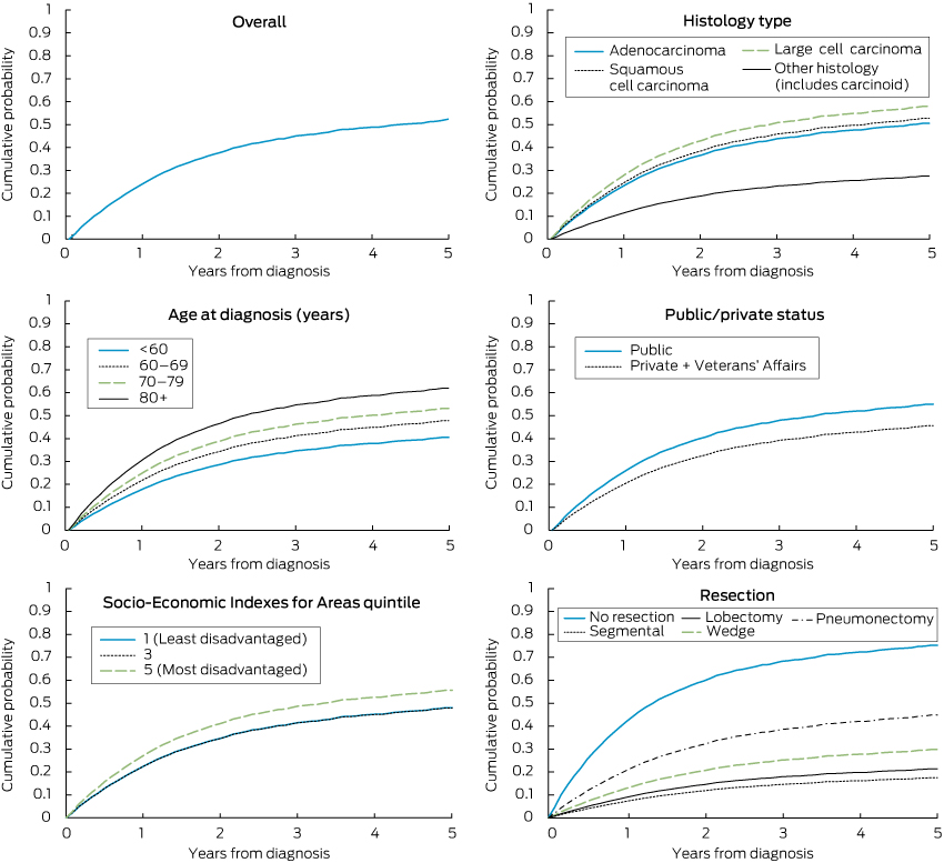 In the meantime, the results of this study are consistent with guideline recommendations that resection be used for localised NSCLC.7-10 Results indicate marked differences in probability of lung cancer death in the first 5 years from diagnosis of localised NSCLC in NSW depending on whether resection is undertaken. Potential exists to reduce numbers of deaths from lung cancer in NSCLC cases by increasing resection rates.