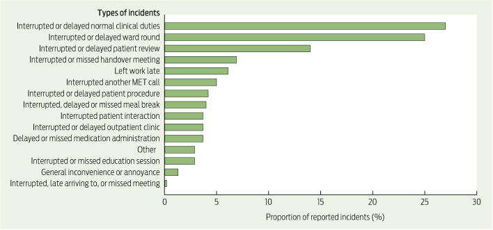 Results: During the study period, 1490 structured interviews were conducted, and 279 written questionnaires were returned (overall response rate, 66.4%). There were no adverse events. There were 378 recorded incidents. The incident rate was 213.7 incidents per 1000 MET participant attendances (95% CI, 194.8–233.5), and 1.1 incidents per MET call. Using the severity assessment code, 99.5% of incidents were classified as minimum. The most commonly reported incidents were disruptions to normal duties, ward rounds, and patient reviews. Only 0.8% of incidents were reported on institutional incident reporting systems.