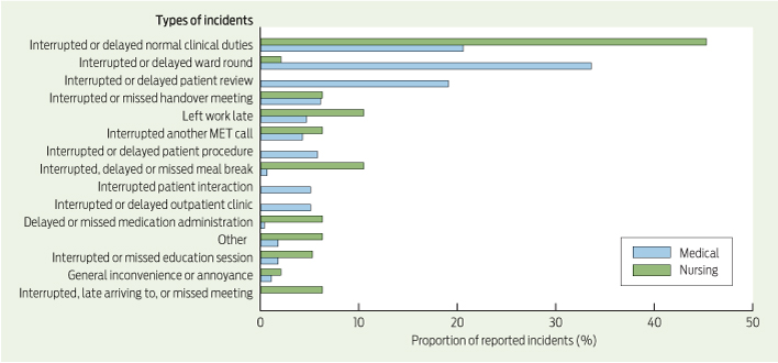 The observation that medical staff reported more incidents than nursing staff is consistent with work arrangements. Ward nursing staff provide cover when fellow staff members are indisposed. Medical staff and specialist nursing staff are less likely to have cover because of the specialised nature of their work. Improving cover if MET duty is predicted to affect activities such as procedures, clinics, ward rounds or meal breaks may reduce disruption.