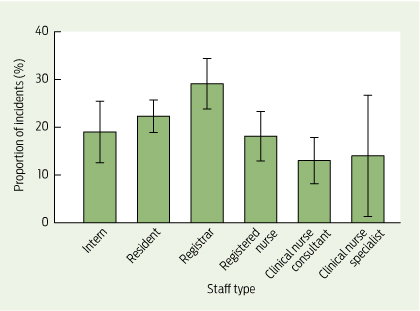 Medical staff and nursing staff reported 243.0 and 156.8 incidents per 1000 MET participant attendances, respectively (P < 0.001). The types of incidents and the proportions of each are shown by role (medical or nursing) in Box 2, and overall proportions by staff type in Box 3. Most incidents (127; 38.3%) occurred during daytime hours, 113 in the evening (34.0%) and 92 during night-time (27.7%) (Appendix 2).
