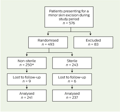 Prior studies of wound infection after minor surgery involving GPs in Mackay, Queensland, showed overall incidences of wound infection of 8.6% and 8.9%.13-16 This incidence was higher than expected based on published results of a similar Australian general practice cohort (1.9%),17 a skin cancer clinic cohort (1.5%)18 and a European dermatology clinic cohort (2%).19 A suggested acceptable rate of infection after clean minor surgery is less than 5%.20 The reason for our high infection rate is unclear, but may be related to the hot, humid environment, or to patient behaviour in our rural setting. A low risk of infection after clean surgery means that studies of more than 1000 procedures (sometimes many more) are required, under normal circumstances, to detect a clinically relevant difference in infection from an intervention with statistical confidence.21 Because of the high incidence of infection in our patient cohort, and the high minor surgery workload,22 we decided to use this capacity to investigate the effect of gloves on infection rates. Our trial sought to establish whether non-sterile clean boxed gloves were non-inferior to sterile gloves with regard to surgical site infection after minor skin excisions.