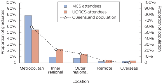 The proportion of participants currently practising in a rural area was lowest for those with a metropolitan background who attended a metropolitan clinical school (reference group; 16.9% [61/361]), intermediate for those with a rural background who attended a metropolitan school (24.8% [29/117]) and for those with metropolitan background who attended UQRCS (26.8% [42/157]), and highest for those with a rural background who attended UQRCS (61.3% [73/119]). For all rural ASGC-RA categories, the proportion of practitioners who had attended UQRCS was about twice that of those who attended an MCS (RA2, 9.2% [44/478] v 22.5% [62/276]; RA3, 7.5% [36/478] v 14.5% [40/276]; RA4, 1.0% [5/478] v 2.5% [7/276]; RA5, 1.0% [5/478] v 2.2% [6/276]). Also, the geographic distribution of UQRCS graduates matched the distribution of Queensland's general population more closely than that of MCS graduates (Box 1).