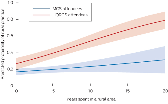 To explore the effect of the duration of rural background on the adjusted predictive probability of current rural practice, we developed a logistic regression model with explanatory variables: UQRCS attendance v MCS attendance, years spent in a rural area (since primary school and before commencing UQ medical degree) as a continuous variable, and an interaction term between these two variables (Box 3). The predicted probabilities are divergent across the range of years spent in a rural area. In UQRCS attendees with 10 and 20 years of rural exposure, the predicted probabilities of rural practice are 54% (95% CI, 46%–62%) and 79% (95% CI, 69%–89%), respectively.