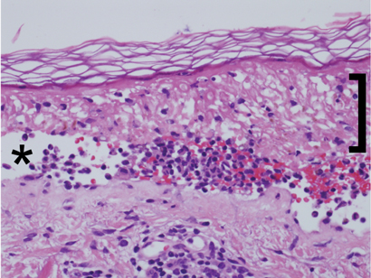 Histopathological examination (Box 3) showed extensive epidermal necrosis and subepidermal clefting with a sparse superficial perivascular infiltrate of lymphocytes, occasional neutrophils and eosinophils, and exocytosis of cells into the epidermis. Results of staining for immunofluorescence were negative. This was consistent with the clinical diagnosis of TEN, and the possibility of pemphigus vulgaris was excluded.
