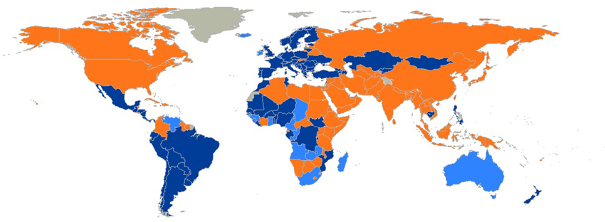 Country status: dark blue = state party (78 countries); light blue = signatory (18 countries); orange = no action (101 countries). * Reproduced with permission from United Nations Human Rights, Office of the High Commissioner for Human Rights. Optional Protocol to the Convention against Torture Subcommittee on Prevention of Torture. http://www.ohchr.org/EN/HRBodies/OPCAT/Pages/OPCATIndex.aspx (accessed May 2015).