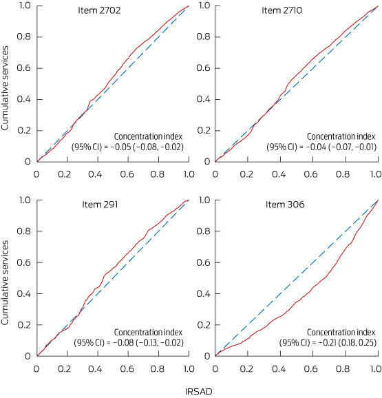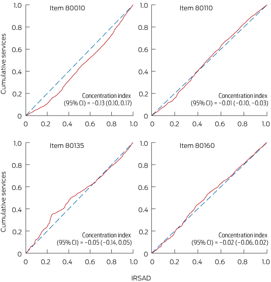 The Public Interest Advocacy Centre, a Sydney-based group actively concerned with social and political issues such as equity of service delivery and transparency of government, assisted with our freedom of information request for non-identifiable national Medicare data. Martin Knapp at the London School of Economics and Political Science introduced some of us to the use of the concentration index for such analyses.