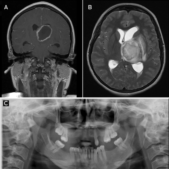 Magnetic resonance imaging showed a 4.6 × 5.1 cm ring-enhancing lesion in the left thalamus, with extensive surrounding oedema (Figure, A and B).