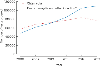 There was a 2.3-fold increase in the use of dual NAATs for chlamydia and gonorrhoea among women in Victoria over the study period, from 47 134 tests in 2008 to 110 209 in 2013 (Box 1). The number of chlamydia tests alone increased 1.3-fold, from 56 916 tests in 2008 to 76 485 tests in 2013.