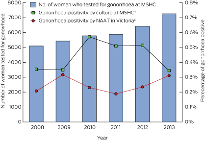 Design, setting and participants: Retrospective analysis of Medicare reporting of dual NAATs in Victoria, Victorian Department of Health gonorrhoea notifications, and gonorrhoea culture data at the Melbourne Sexual Health Centre (MSHC), among women, 2008 to 2013.