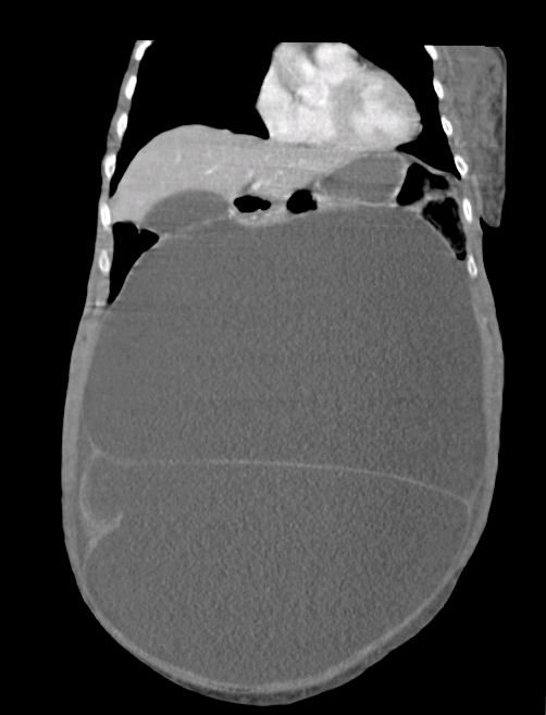 Formal imaging showed a large intraperitoneal structure. The 4-Hounsfield unit attenuation was consistent with simple fluid. However, identification of septations, together with rim enhancement, led to a revised diagnosis of a cystic mass. The lesion measured 24 cm × 28 cm × 33 cm and, at an estimated volume of 16 L, displaced most of the abdominal and pelvic viscera. Fortunately, this was recognised before paracentesis.