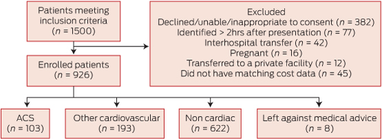 Design, setting and participants: Prospectively collected data on ED patients presenting with suspected ACS between November 2008 and February 2011 was used, including data on presentation and at 30 days after presentation. Information on patient disposition, length of stay and costs incurred was extracted from hospital administration records.