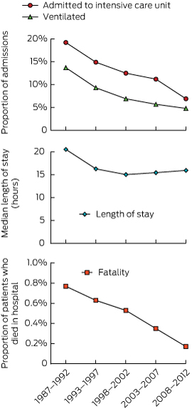We investigated the changes in morbidity and mortality over the study period by dividing admissions into those in the first 6 years, reported previously,20 and four subsequent 5-year periods (Box 1). Over this period, the rate of admission to ICU dropped from 19.2% (376/1955) to 6.9% (280/4060) and rate of mechanical ventilation from 13.7% (268/1955) to 4.8% (193/4060). The fatality rate dropped from 0.77% (15/1955) to 0.17% (7/4060). The median LOS decreased from 20.5 hours in the first 6 years to about 16 hours in all subsequent 5-year periods.