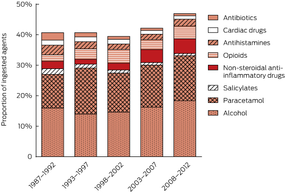 Our data have inherent limitations. There is likely to be selection bias against less severe poisonings (the types of cases where patients might not present for medical attention) and rapidly lethal poisonings (cases in which patients die outside hospital). In surveys of self-harm and anecdotal reports from patients, it has been estimated that a significant proportion of people who have self-poisoned (5%–15%) don't present for medical care.3 Also, although there is a prospective data collection form, retrospective review of medical records is often required to complement prospectively collected data. Data on the ingested drugs were based on patient history, including corroborating history obtained from ambulance officers and accompanying people and from information on drug containers. Drug concentrations were not measured in most patients, although previous research on specific drugs has found the patient history of drugs ingested to generally be confirmed by an appropriate assay.24