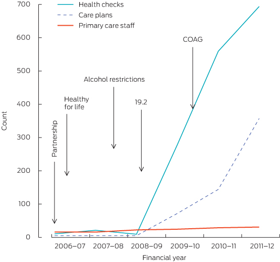 Another key event was the implementation of alcohol restrictions in the Fitzroy Valley in 2008 driven by local community leadership.16 This decreased the acute care workload on health care staff and appeared to increase patient presentation for non-acute care.17