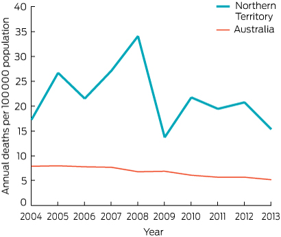 Annual road deaths in Australia have decreased from 7.9 to 5.2 per 100 000 population in the period from 2004 to 2013 (Box).1 In contrast to the national figures, the Northern Territory has recorded a mean of 21.8 deaths per 100 000 over the same period.
