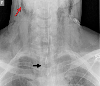 He had a Glasgow Coma Scale score of 15, with normal vital signs, and was found to have a 1 cm wound just above his cricoid cartilage slightly to the right of midline. There was minimal active bleeding externally, but air occasionally bubbled from the wound and surgical emphysema was palpable on the right side of his neck. He was most comfortable slightly head down on his right side, and was maintaining O2 saturation of 99% in room air, with no clinical evidence of pneumothorax.