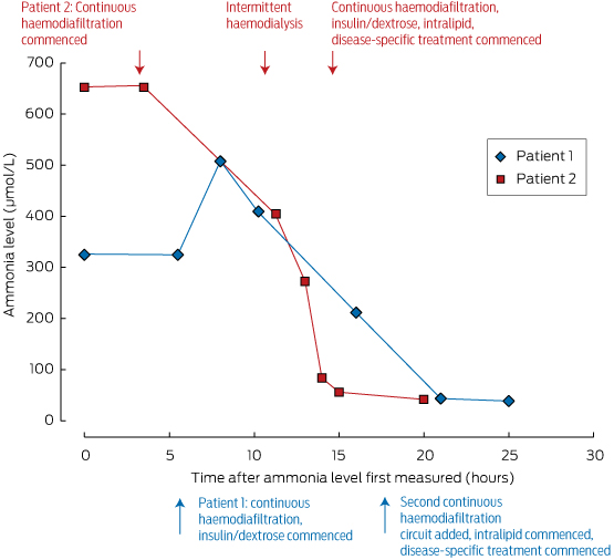 * Note the rapid rate of decline of serum ammonia levels in Patient 2 achieved after initiating intermittent haemodialysis (about 10 hours after first measurement).