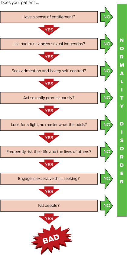 The Delphi process was used to select the eight behaviours that were consistent with a diagnosis of BAD: sense of entitlement, use of bad puns and sexual innuendos, craving for admiration and self-centredness, sexual promiscuity, excessive fighting, taking risks with one’s own life or those of others, excessive thrill seeking, and murder. All eight behaviours must be present for the diagnosis to be confirmed. If the individual presents with further symptoms listed in Box 1, it merely reflects increased severity of the diagnosed disorder.