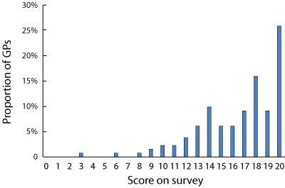 To provide adequate precision, we aimed for 100 GP responses. The survey was mailed to all 240 GPs listed in the 2014 edition of the Medical Practitioners’ Directory for the Nepean, Blue Mountains and Hawkesbury areas. This was the most extensive directory of GPs in this area available to us. Responses were returned in a coded envelope inside a postage-paid envelope. GPs who did not respond were resent surveys on up to two additional occasions.