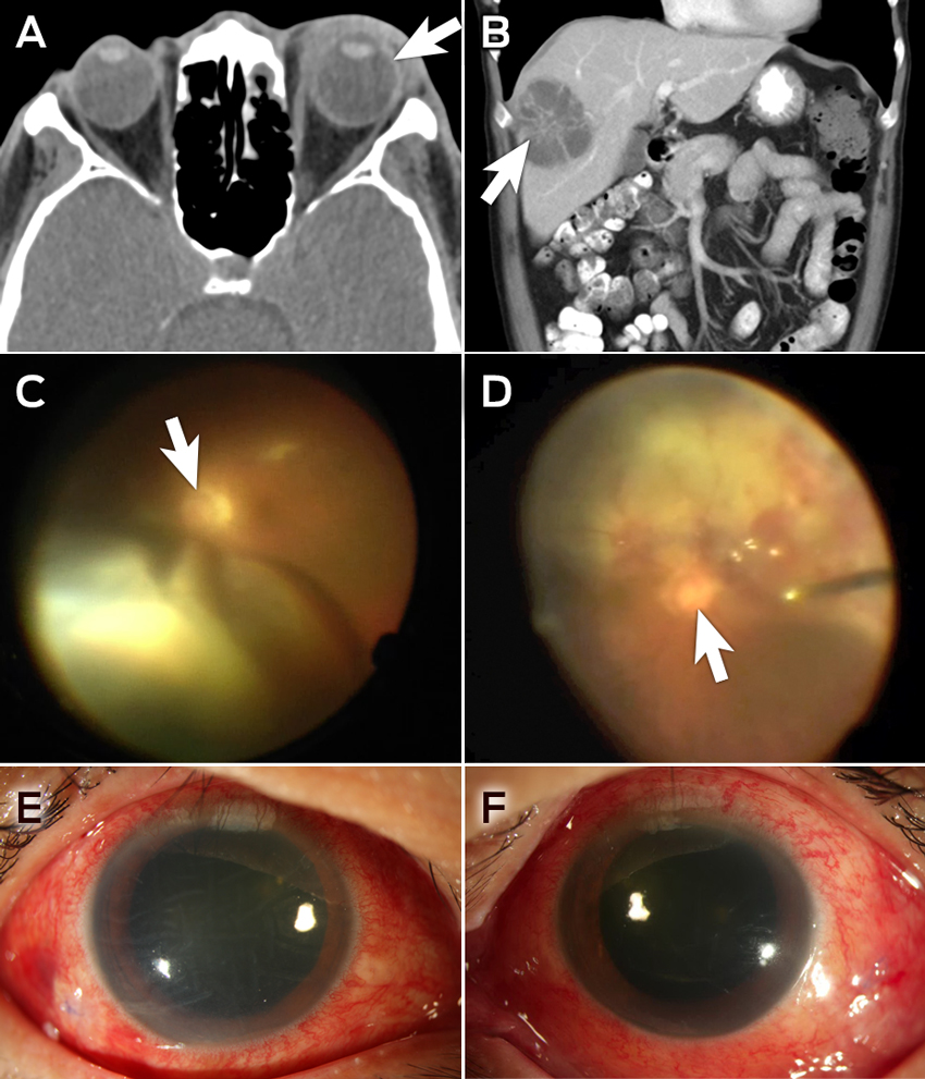 A, B: Intraoperative photographs of the posterior segment of the eye, showing retinal detachment with a subretinal abscess in the right eye (A) and a subretinal abscess in the left eye (B); the white arrows indicate the optic nerves. C: Computed tomography (CT) image of the orbits at presentation, showing left-sided proptosis with associated inflammation of the sclera (white arrow) and periorbital soft tissues. D: Abdominal CT scan, showing a 5.0 × 5.7 cm abscess (white arrow) in segments V/VIII of the liver. E, F: Slit lamp photos of the right (E) and left (F) eyes 13 days after initial presentation.