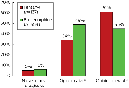 A cross-sectional cohort study was undertaken to determine the use of analgesics in the 4 weeks prior to initiation of fentanyl and buprenorphine transdermal patches. Incident opioid patch use was defined as the first (index) dispensing of a fentanyl or buprenorphine patch between 1 July 2008 and 30 September 2013, with no use during the previous year. Patients who received their index opioid patch at the time of their admission to the residential aged care facility were excluded, because their analgesic use in the previous year could not be established. The proportions of residents initiated on patches who were naive to all analgesics or to opioids and those who were opioid-tolerant were determined. Opioid-naive users were defined as those who had not received an opioid analgesic (but may have received other simple or NSAID analgesics) in the 4 weeks prior to their first patch. Opioid-tolerant residents were those who had received an opioid, either regularly or pro re nata, in the 4-week period before patch initiation. The initiation strength of the patches was also determined.
