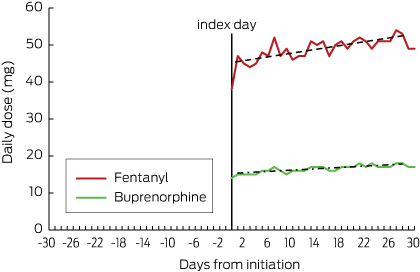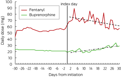 Commencement of any opioid in older patients requires a “start low and go slow” approach.7 A low initial opioid dose followed by cautious upward titration to achieve adequate analgesia is the strategy recommended by the current Australian guidelines.8,9 One limitation of transdermal patches is the lack of flexibility in dosing titration.17 Use of transdermal buprenorphine in opioid-naive aged care residents, although pharmacologically appropriate for managing chronic pain, does not allow adequate titration and may result in over- or underdosing. In our study, doses of regular concurrent opioids continued to increase after initiation of transdermal buprenorphine in aged care residents, suggesting that underdosing and inadequate pain relief may be problems.