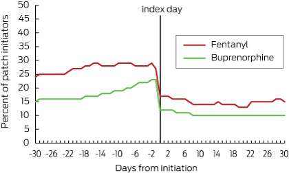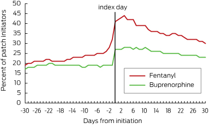 The proportion of residents starting on a fentanyl or buprenorphine patch who received opioids (regularly or pro re nata) during the 30 days before or after patch initiation was calculated as a percentage of the entire sample of patch initiators.