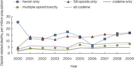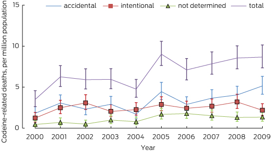 Results: The overall rate of codeine-related deaths increased from 3.5 per million in 2000 to 8.7 per million in 2009. Deaths attributed to accidental overdoses were more common (48.8%) than intentional deaths (34.7%), and their proportion increased during the study period. High rates of prior comorbid mental health (53.6%), substance use (36.1%) and chronic pain (35.8%) problems were recorded for these deaths. For every two Schedule 8 opioid-related deaths in 2009, there was one codeine-related death. Most codeine-related deaths (83.7%) were the result of multiple drug toxicity.