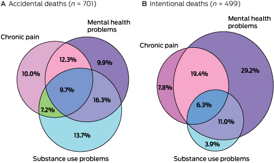 Those who had intentionally overdosed were more likely to be older, female and have a history of mental health problems, and were less likely to have a history of substance use problems, chronic pain or injecting drug use (Box 3). Mental health problems were common in those involved in intentional deaths, and the combination of chronic pain and mental health problems were recorded for 25.7% of these cases (Box 4).