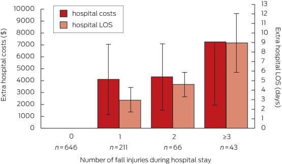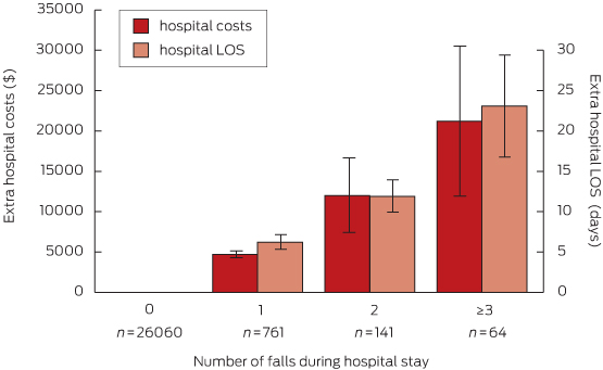 Results: We found that 966 of a total of 27 026 hospital admissions (3.6%) involved at least one fall, and 313 (1.2%) at least one fall injury, a total of 1330 falls and 418 fall injuries. After adjustment for age, sex, cognitive impairment, admission type, comorbidity and clustering by hospital, patients who had an in-hospital fall had a mean increase in LOS of 8 days (95% CI, 5.8–10.4; P < 0.001) compared with non-fallers, and incurred mean additional hospital costs of $6669 (95% CI, $3888–$9450; P < 0.001). Patients with a fall-related injury had a mean increase in LOS of 4 days (95% CI, 1.8–6.6; P = 0.001) compared with those who fell without injury, and there was also a tendency to additional hospital costs (mean, $4727; 95% CI, −$568 to $10 022; P = 0.080).