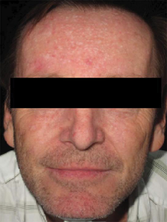 Figure 1: Patient’s facial fibrofolliculomas and trichodiscomas presenting as innumerable small white papules on the forehead, cheeks and chin.