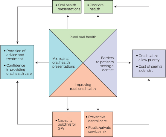 Results: Four major themes emerged from the interviews: rural oral health, managing oral health presentations, barriers to patients seeing a dentist, and improving oral health. Rural GPs saw patients with a range of oral health problems, including toothache, abscesses and trauma, and observed poor oral health in their communities. Some acknowledged that they were not confident when dealing with oral health problems; they typically provided short-term pain relief, prescriptions for antibiotics, and advised patients to see a dentist. Participants noted that rural patients may not see a dentist when advised to do so because symptoms had abated, oral health was regarded as a low priority, or the costs of travelling to and seeing a dentist discouraged them. The interviewees recommended building the capacity of GPs to better care for patients with oral health problems, establishing more effective communication and referral pathways between GPs and dentists, focusing on preventive dental care, and delivering dental services in more flexible and consistent ways that better meet the needs of the communities.