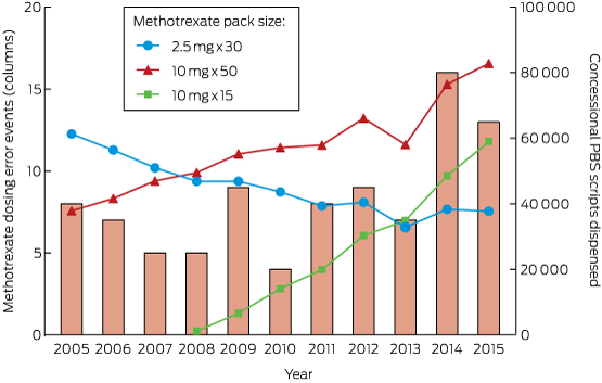 Box 1 – Methotrexate medication error events reported to Australian Poisons Information Centres, and the quantity of each methotrexate pack size dispensed to concessional patients through the Pharmaceutical Benefits Scheme, 2005–2015