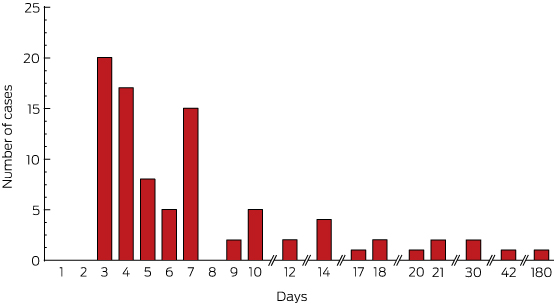 In the PIC dataset, exact ages were recorded in 51% of cases (median age, 65 years; IQR, 52–77 years; range, 28–91 years); at least 18 patients were over 75 years of age. Fifty-five of the 92 patients were women; sex was not recorded in seven cases. Call records documented a range of symptoms, including stomatitis, vomiting, reduced blood cell count and fever. The median number of consecutive days for which methotrexate was taken was 5 (IQR, 4–9 days; range, 3–180 days); the distribution was skewed (Box 2), with 20 cases involving methotrexate taken for 3 consecutive days. The median daily dose taken was 10 mg (IQR, 10–15 mg; range, 2.5–60 mg). Box 3 summarises data on the doses and durations of administration in medication errors reported to PICs.