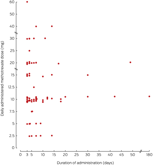 The TGA DAEN included 16 reports of methotrexate-related adverse events meeting our search criteria, including five deaths. These were reviewed for inclusion, and unintended daily dosing was documented in ten cases (median age, 58 years; IQR, 42–74 years; range, 41–85 years; eight women), including two deaths (two women, aged 71 and 83 years).