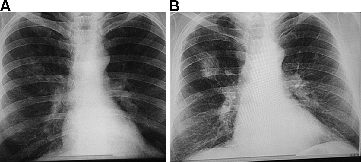 Box 1 – Chest x-rays of a coal worker (A) showing background nodulation and early progressive massive fibrosis (PMF) in the right upper zone, and (B) 12 years later, showing PMF