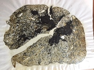 Box 2 – Gough section of a coal worker’s lung showing coal workers’ pneumoconiosis with progressive massive fibrosis