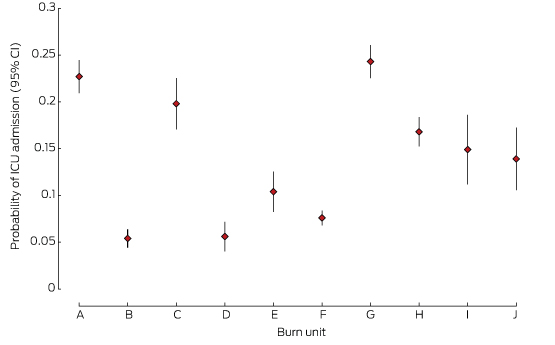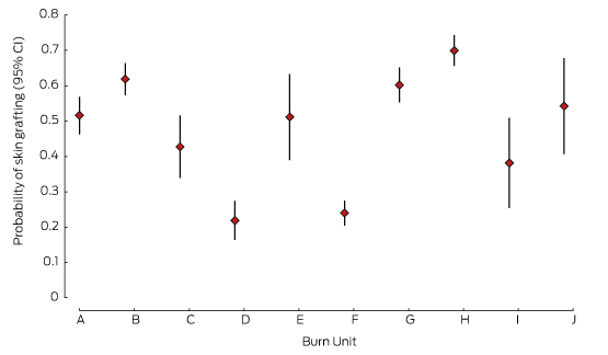 Scarring and its associated symptoms, functional deficits and deformity, are inevitable outcomes of burn injury, and they determine the capacity for successful rehabilitation and social re-integration. Surgical treatment is one of the few techniques for influencing scarring and other outcomes,13 and our data indicate that the rates of grafting differ between units. The relationship of these differences in surgical management with long term outcomes remains to be determined. The introduction of grafting protocols based on objective determination of the depth of burn injury is required to address variation in this fundamental aspect of burn care, and to provide evidence that supports such protocols. There were also considerable differences in the rates of admission to ICUs in the higher volume statewide services, and in the rates of diagnosis of inhalation injury. The rates of ICU admission differed between hospitals despite our adjusting for inhalation injury. While it might be hypothesised that diagnosis of inhalation injury that increases the risk of airway obstruction drives pre-hospital intubation and subsequent ICU admission, this does not appear to be the case in our study. We suggest that specific transfer protocols in certain jurisdictions can affect rates of intubation as patients are stabilised for early transfer. Demonstrated differences in practice are not insignificant in terms of resource requirements and interventions that are not without risk. Further investigation of pre-burn hospital management practices and diagnostic methods for inhalation injury will inform improvements in protocols for care delivered to patients suspected of having sustained an inhalation injury.14