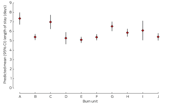 The hospital stay caused by burn injury is longer than for other kinds of trauma, and is the most significant contributor to the cost of acute burn treatment.1 Attention to variables that influence LOS is particularly important for ensuring that care is delivered efficiently. BRANZ data indicate significant variation in LOS between units. Time to surgery has been reported to influence several aspects of burn care outcomes, including LOS;13 however, other factors could also affect this outcome, such as mobilisation protocols and social and geographical constraints on discharge from hospital. The variation we identified constitutes a flag that signals the need to examine possible contributors at the hospital level that may be amenable to changes that will improve care.