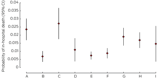 There were differences between units in the adjusted odds of mortality, with three units reporting significantly lower estimated probabilities of death (B, E, F) than the two units with the highest estimates (A, C), despite large CIs (Box 2, Box 6). There were no deaths in unit J, which was therefore excluded from this analysis.