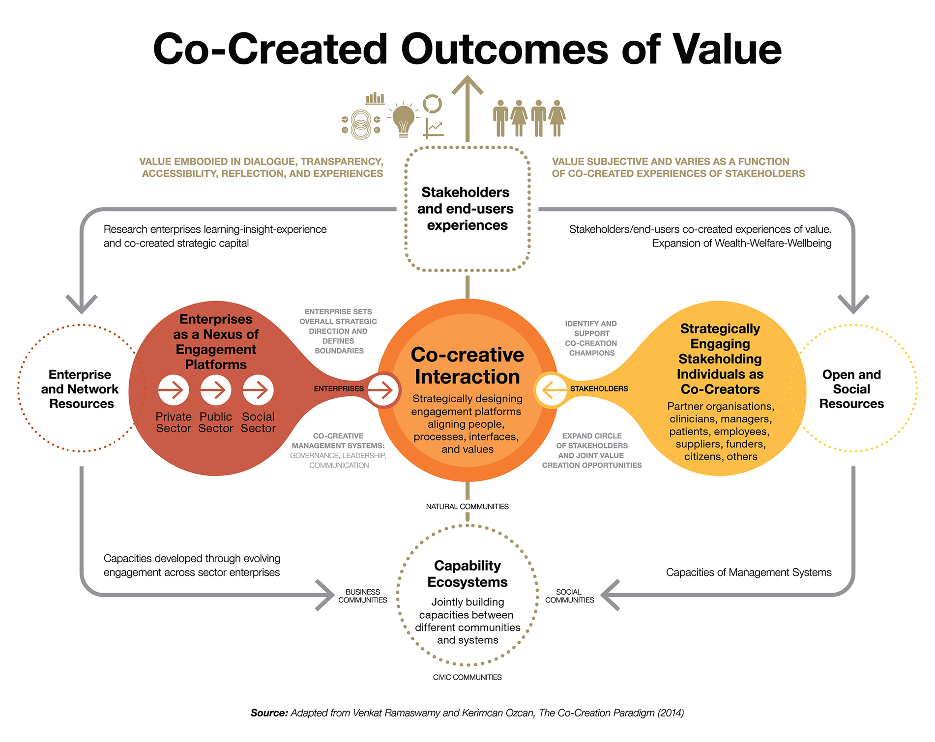 A co-creative enterprise must be cognisant of maximising the ecosystems of capabilities in the social, business, civic, and natural communities in which stakeholders exist to produce new co-creative capacities of value creation.17 It is important for the enterprise to assess value in order to verify that those involved have generated new value. Further to this, it is imperative to recognise that value is subjective and varies as a function of the co-creation experiences of stakeholders, both their experiences in interacting through the platform and the experiences of the co-created outcomes.17,29 There are many different kinds of value — economic or societal gains, organisational improvement, personal achievements, satisfied stakeholders just to name a few.17