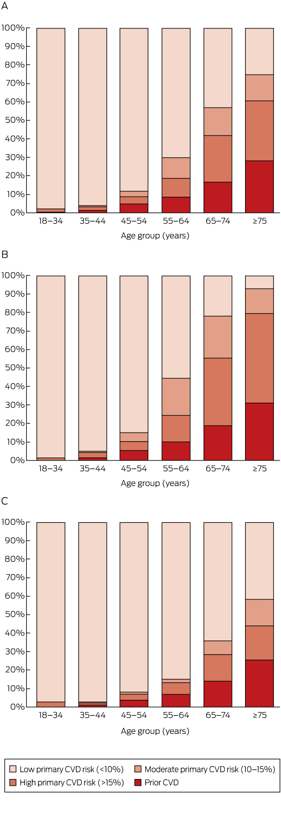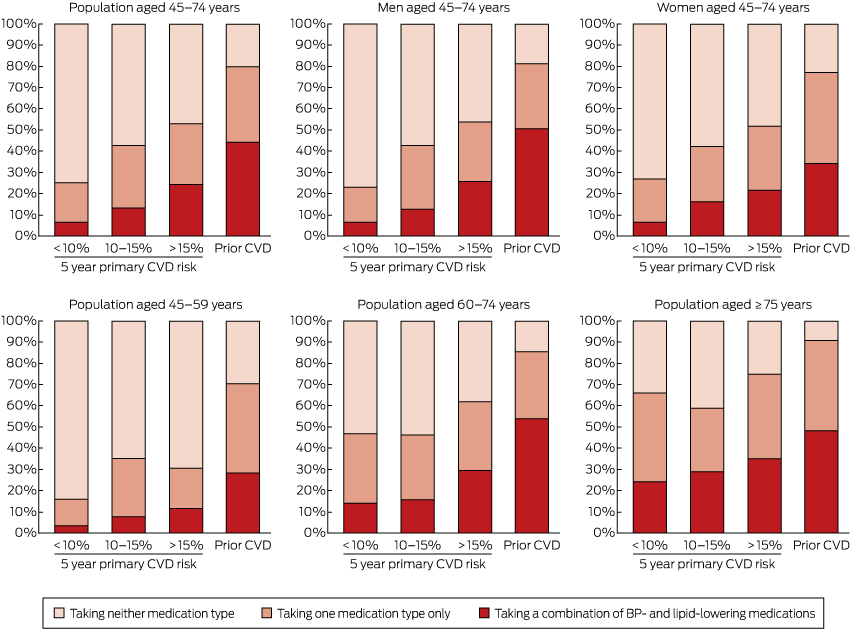 Results: Absolute CVD risk increased with age and was higher among men than women. Overall, 19.9% (95% CI, 18.5–21.3%) of Australians aged 45–74 years had a high absolute risk of a future CVD event (an estimated 1 445 000 people): 8.7% (95% CI, 7.8–9.6%) had prior CVD (estimated 634 000 people) and 11.2% (95% CI, 10.2–12.2%) had high primary CVD risk (estimated 811 000 people). A further 8.6% (95% CI, 7.4–9.8%, estimated 625 000) were at moderate primary CVD risk. Among those with prior CVD, 44.2% (95% CI, 36.8–51.6%) were receiving blood pressure- and lipid-lowering medications, 35.4% (95% CI, 27.8–43.0%) were receiving only one of these, and 20.4% (95% CI, 13.9–26.9%) were receiving neither. Corresponding figures for high primary CVD risk were 24.3% (95% CI, 18.3–30.3%); 28.7% (95% CI, 22.7–34.7%); and 47.1% (95% CI, 39.9–54.3%).