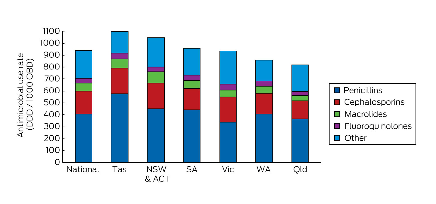 There were noticeable variations between states (Box 1), the highest rates being in Tasmania. The reasons for such variations are not clear. While there is likely to be less antimicrobial use in small states and territories due to lack of availability of highly complex interventions, this would not seem to account for the pattern observed. Higher use in Tas may have been related to statewide adoption of combination narrow spectrum antimicrobials for urinary and intra-abdominal infections (eg, amoxicillin + gentamicin + metronidazole = 10–12 DDD compared with ceftriaxone + metronidazole = 2 DDD). Imbalances in representativeness between states (see Supplementary Table S2 in the Appendix at mja.com.au) are also likely to have contributed to the variation, although even greater variation has been observed nationally between hospitals in the same peer group.13