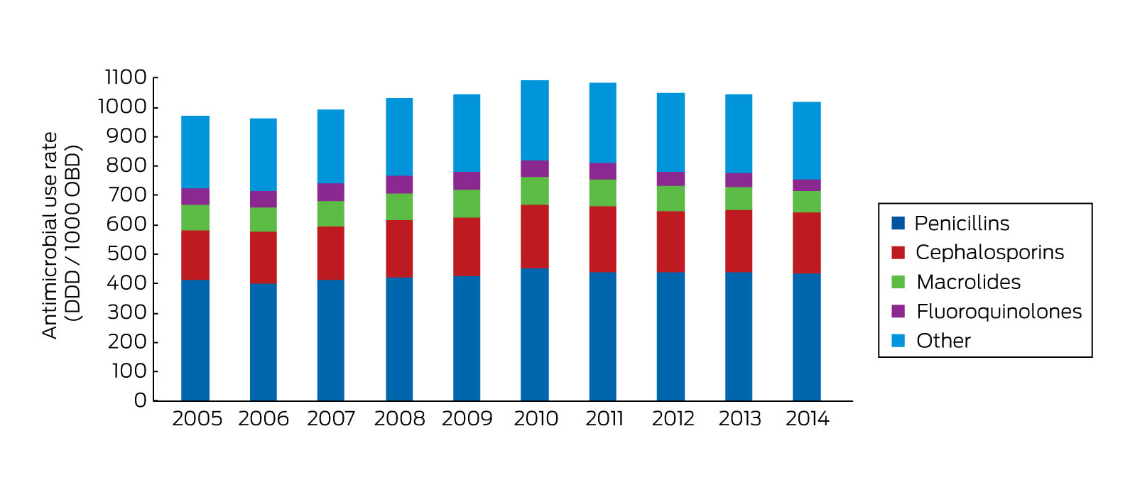 Across all Australian hospitals participating in calendar year 2014, the total aggregate use rate of systemic antimicrobials was 936 DDD/1000 OBD, ranging from a low of 330 to a high of 2040 DDD/1000 OBD — more than a sixfold difference. The overall rate compares with 597 DDD/1000 OBD in Sweden,10 747 DDD/1000 OBD in the Netherlands,11 and 944 DDD/1000 OBD in Denmark.12 These are the only countries currently publishing comparable data.