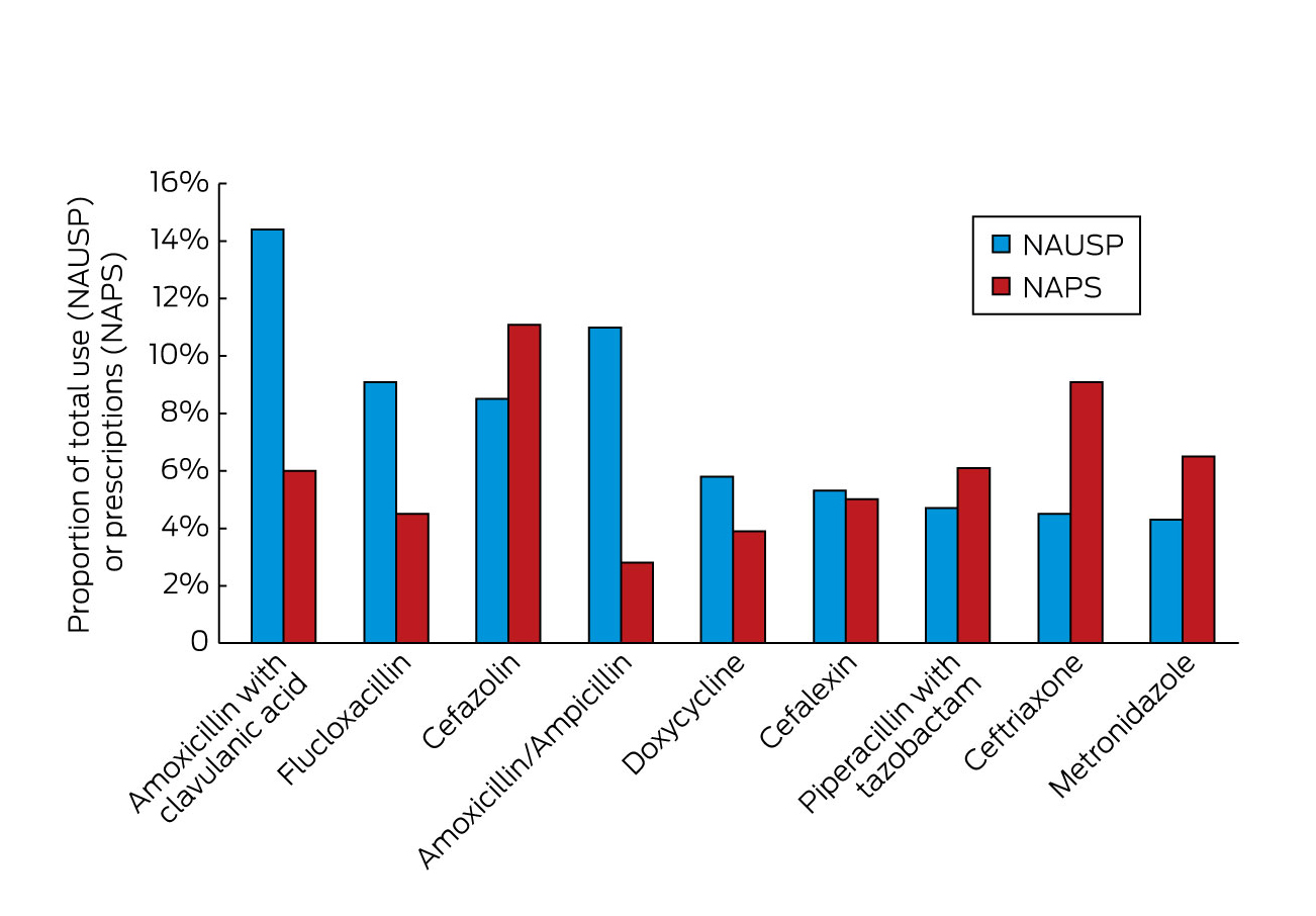 The most commonly prescribed antibacterials in Australia are shown in Box 3 as a percentage of all use or prescriptions. The differences in data collection methods between NAUSP and NAPS mean that there are differences in many of the percentages: NAUSP captures all use throughout the year and provides output as a percentage of total DDD/1000 OBD. NAPS output is cross-sectional data at a point in time or over a short time interval. Hence, agents such as cefazolin, which is prescribed frequently but often for very short durations, features prominently in NAPS, but less so in NAUSP. Of note is the significant proportion of use/prescriptions for ceftriaxone (4.5% in NAUSP and 9.1% in NAPS), an agent that many antimicrobial stewardship teams would consider should be reserved for specific indications and should only be prescribed with stewardship team approval.