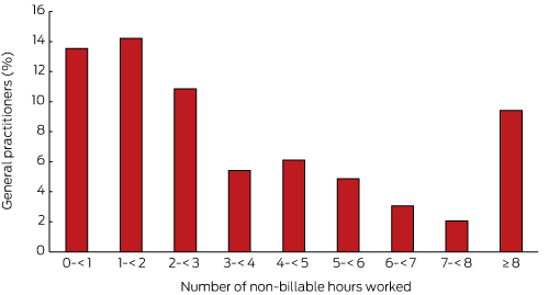 The distribution of non-billable time for patient care was skewed. Of the 1935 GPs surveyed, 30.5% did not record any non-billable time for any of their 40 patient encounters, 56.0% recorded at least one hour, 19.4% at least 5 hours, and nearly 10% recorded 8 or more hours (Box 2).