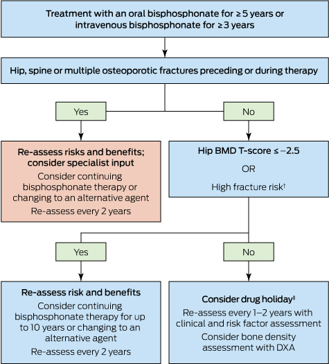 DXA = dual-energy x-ray absorptiometry. * Adapted from Adler, et al.54 † Includes age > 70 years; clinical risk factors for fracture and osteoporosis; fracture risk score on fracture risk calculation tools above the Australian treatment threshold. ‡ Cessation of treatment for 2–3 years.