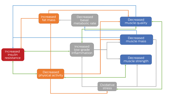 The metabolic outcomes of sarcopenia have received less attention than the functional consequences in the research literature, but they are no less relevant clinically. There are several pathways by which age-related changes in skeletal muscle may contribute to insulin resistance (Box 2). Skeletal muscle is the largest insulin-sensitive tissue in the body and accounts for 80% of glucose uptake under euglycaemic hyperinsulinaemic conditions. Skeletal muscle insulin resistance is a key process in the development of type 2 diabetes, which may be observed decades before β-cell failure and hyperglycaemia develop.14 It is likely that significantly lower skeletal muscle mass results in reduced capacity for glucose disposal in older adults with sarcopenia.